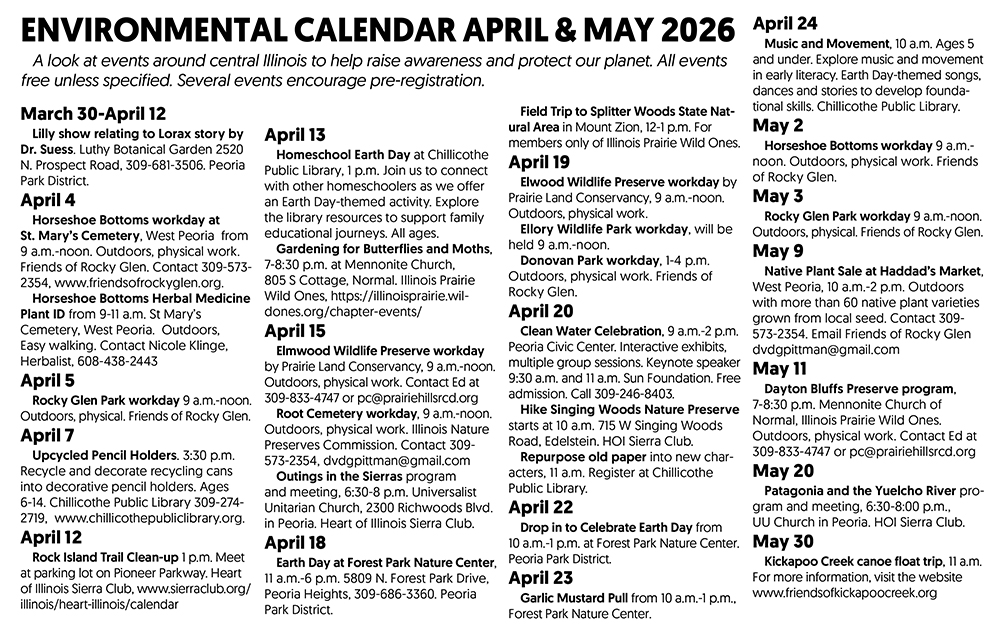 A look at events around central Illinois to help raise awareness and protect our planet. All events free unless specified. Several events encourage pre-registration.