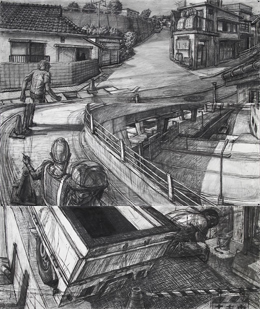 While there are many exceptional pieces, Christopher Troutman in the Heuser Gallery is the most visually inventive and intelligent. Scale gives him a distinct perceptual advantage. He fills up every inch of a 5-by-6-foot drawing with formal dislocations that teeter cinematically. Titled “Up and Down, Kyushu and Illinois,” it collapses three horizontal images of a street construction site that impinge on time and space. Each is linked by co-incidental structural details in the rendered road surface and surrounding architecture. Drawn like a draft of a superhero-comic, it tracks abruptly as we blink through sections of its gestural episodic structure. Troutman escorts us through the center of an uncanny, almost Hitchcockian, municipality searching for clues buried in his fluid charcoal ground.