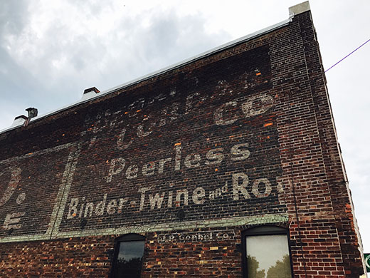 The “ghost” writing on the side of the Prairie Center of the Arts is a reminder of Peoria’s past industrial roots.