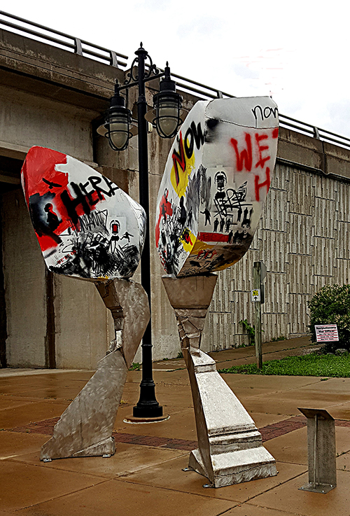 The 2022 “Sculpture Walk” includes We’re Here by Chris Wubbena of Jackson, Mo. It’s a stainless steel structure mixing graffiti, text and imagery. (BILL KNIGHT)