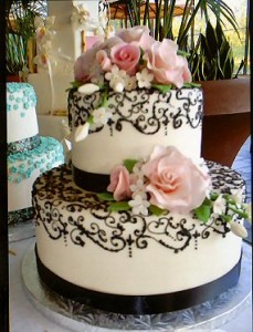 Because beach weddings are so “in vogue” right now, Pitcher’s most popular wedding cake is a Seashell Cake. It is a three-tier round cake decorated with chocolate candy seashells made by decorators in her shop. “Everything on this cake is edible.” she enthuses.