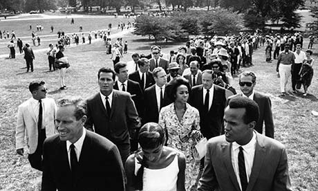 Harry Belafonte, front right, was at 1963’s March on Washington for Jobs and Freedom with a contingent of celebrities. Also shown are Charlton Heston, James Garner, Diahann Carroll, Paul Newman and Marlon Brando.