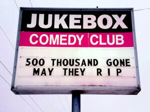 NO JOKE: Back in 2021, the sign at the Jukebox Comedy Club recognizes those who died during the COVID pandemic.