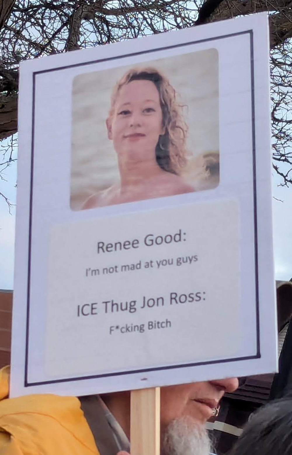 Several signs with the late Renee Good were held up by participants in the candlelight vigil held for the 37-year-old who was killed in Minneapolis by ICE agent Jon Ross, at Main and University. KANDAS MERRIAM