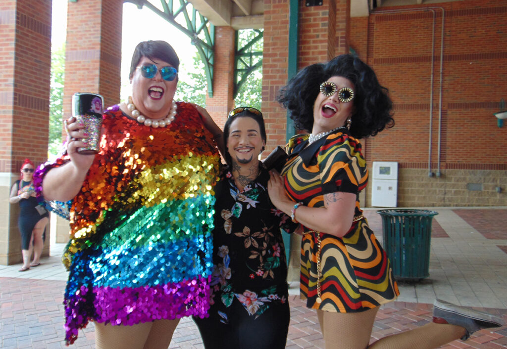 Miss Flo NoMo’ (left), Victor VonVicious and Penny Cost greet patrons at the front gate at River City Pride Fest last month on the Riverfront.