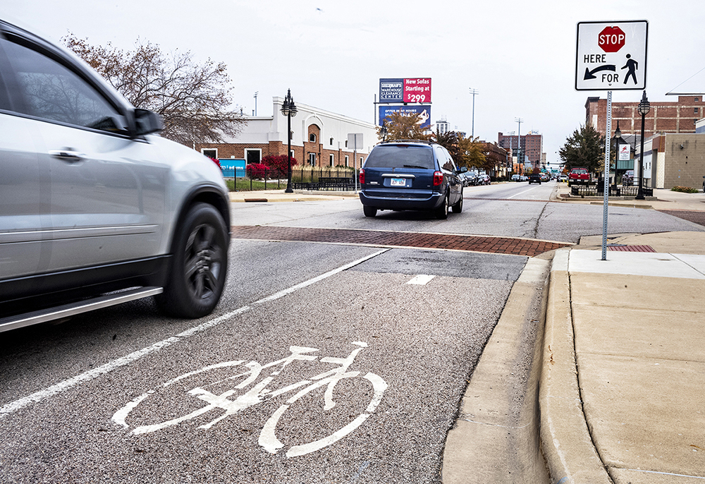Traffic moves on Southeast Adams Street where city officials implemented the “Complete Streets Policy” designed to be safe for pedestrians, bicyclists, motorists and public transportation. The city plans to expand the program on Adams Street and Jefferson Street in downtown Peoria. Changes include returning streets to two-way traffic, inclusion of marked bicycle lanes and precautionary signage