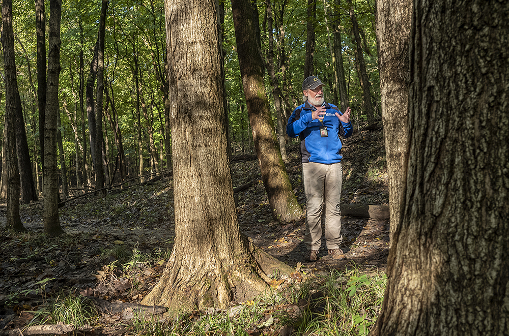 Mike Miller, supervisor of environmental and interpretive services at the Peoria Park District, pauses at the start of Wilderness Trail at Forest Park Nature Center and says the property will remain accessible to the public following its purchase by Peoria Park District. (PHOTO BY DAVID ZALAZNIK)