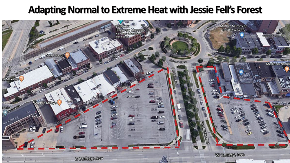 To create what could be called the “Jessie Fell’s Parking Forest,” Normal would extend Uptown Circle into the triangular wedge of asphalt parking, pictured below, north to College Avenue. It will take 20 years for trees to grow into the job; but that is when we will really need them. As the Chinese proverb says, “The best time to plant a tree was 20 years ago. The next best time is now.” And now it must be; 20 years from now will be too late. Too late to save the Sugar Creek Art Festival from cancelation due to withering street heat. Too late to save the Corn Festival. Too late for just about any July-August street event. However, with Fell’s Forest in place, summer street events can be moved under the shade of trees.