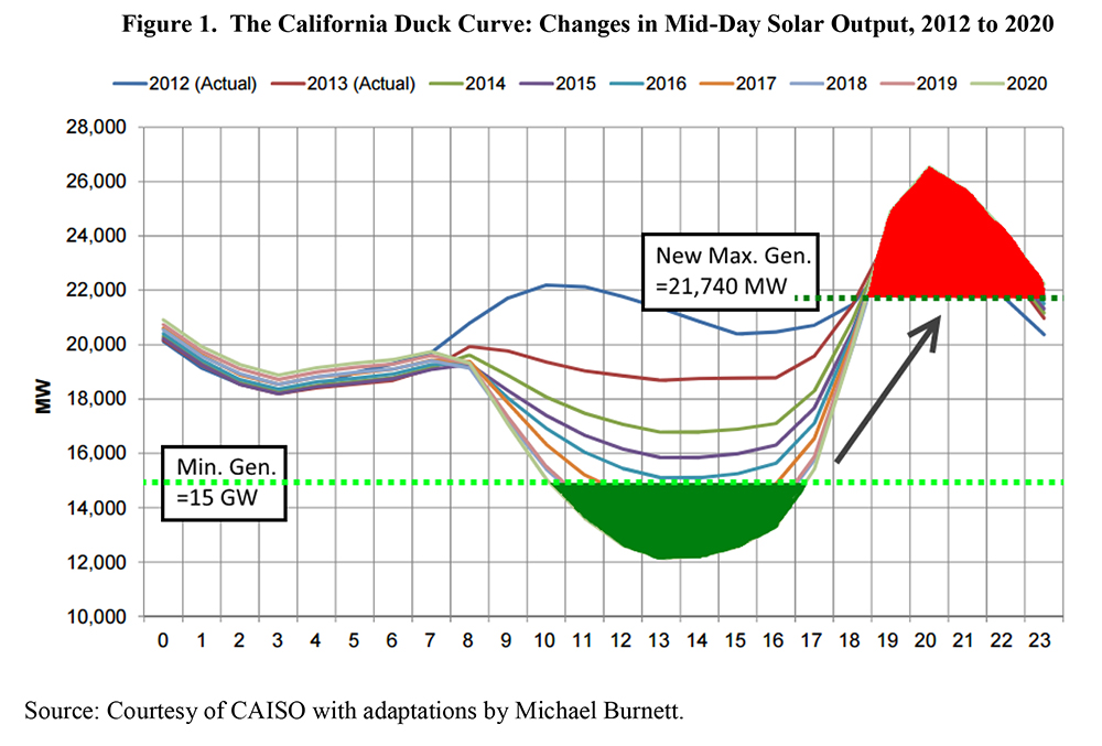 However, rapid dispatchability is exactly what the solar “duck curve” in Figure 1 requires. Developed by Brad Bouillon, from California’s Independent System Operator (CAISO), the figure charted California’s anticipated growth in solar output from 2012 to 2020. CAISO showed that the net load on the grid — the amount of electricity delivered by fossil and nuclear power plants — would drop from roughly 21,000 to 12,000 megawatts. Because of the huge drop in midday net load 2012 to 2020, the net load shape looks like a fat duck, its distended belly in 2020 the result of 10,000 megawatts of solar energy replacing fossil-nuclear energy.
