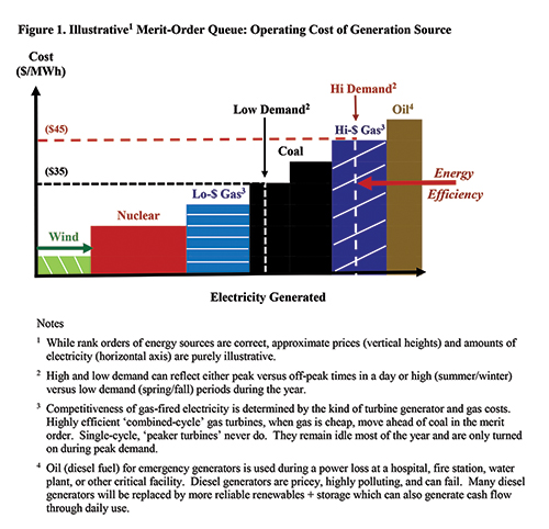 Figure 1 shows how a deregulated electricity market works. When a utility wants to buy lots of electricity, the market manager stacks bids from the lowest- to the highest-cost bid needed to fill the order. That stack is the “merit-order queue.” Everyone in the queue receives the price of the last, highest-cost bid (the market clearing price). Lowest-cost producers receive good returns, higher-cost entrants scrape by, and those failing the merit-order cut go out of business. As Figure 1 indicates, coal is being squeezed on the left by the expansion of wind power and on the right by energy efficiency’s reduction of total demand. Coal-sourced electricity declined -4.9 MMWh per year, 2008 to 2020 because energy efficiency, gas, wind, and nukes respectively wrested from coal +1.8, +1.6, +1.1 and +0.35 MMWh per year. This zero-sum contest dictated everyone else’s gain as coal’s loss.