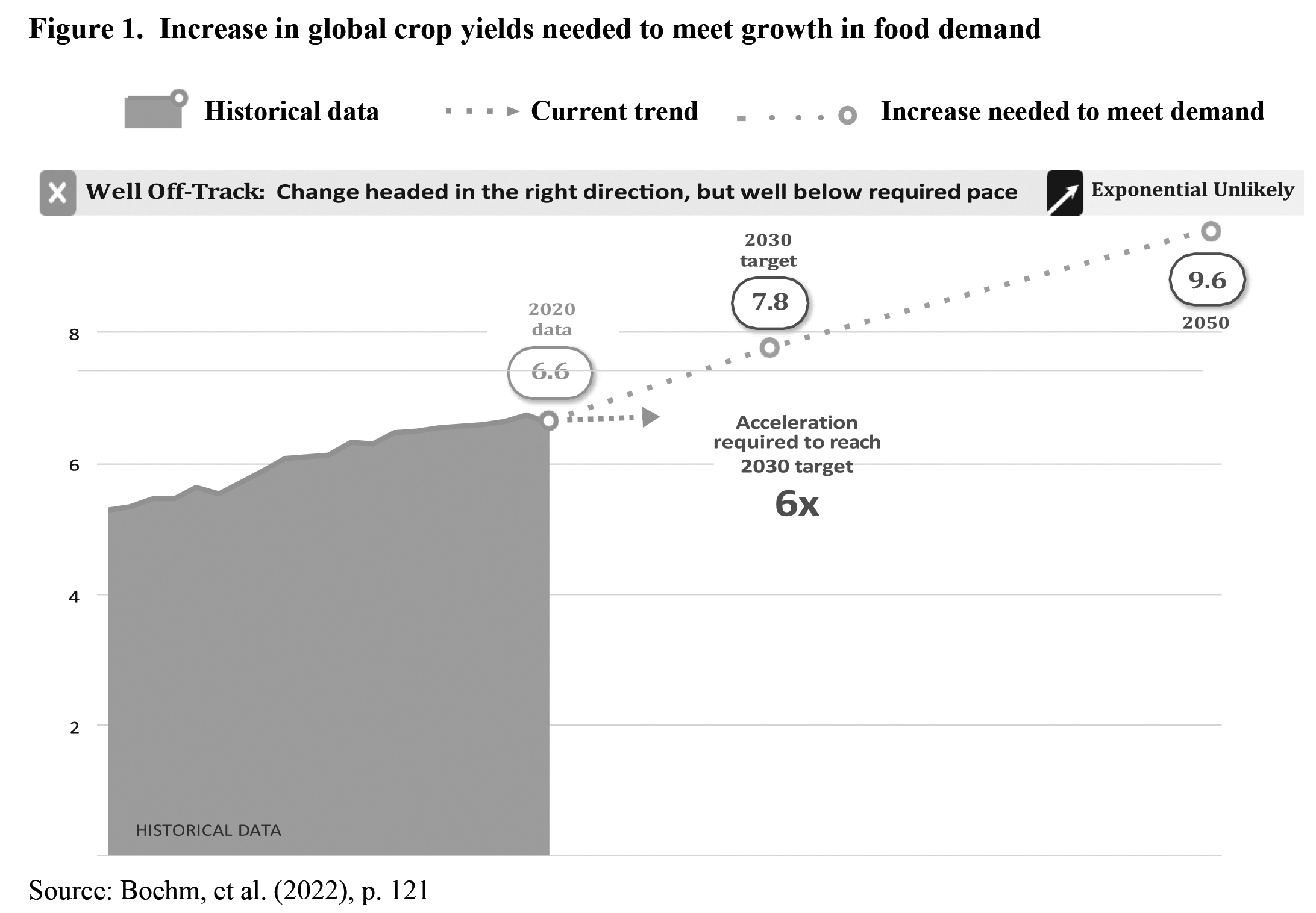 If we set aside this worst-case scenario, things are still dire. Global food demand is projected to increase 45% by 2050. As Figure 1 shows, our current agricultural system will be unable to meet this increase. Moreover, agriculture relies heavily on greenhouse gas-generating practices, which means that food production, processing, and delivery generate about 30% of global carbon emissions (Boehm 2022). Agriculture must reduce its emissions if we are to stabilize the climate, but emissions are still increasing.