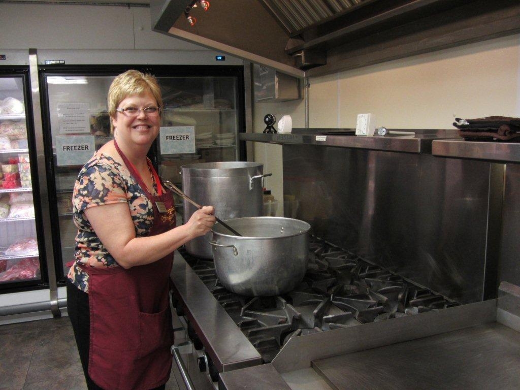 CUTLINE: Claire Crone stirs the soup being served that particular day at Sophia’s Kitchen. Patrons receiving food number in the hundreds. The kitchen is located at 103 S. Richard Pryor Place and provides nourishment and encouragement to those in need.