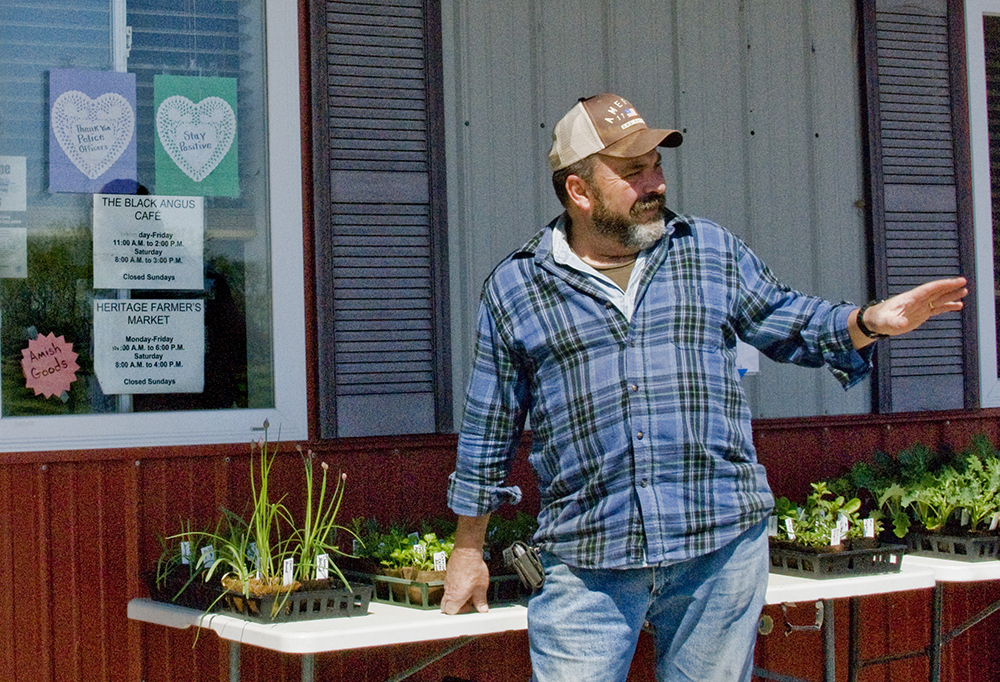 Doug Sassman greets a customer outside his Heritage Farmers Market on Route 9 east of Pekin. Since the pandemic hit and industrial slaughter houses were forced to close, Sassman has seen his sales increase 1,800%. He hopes when restrictions are lifted and life returns to a more normal routine, customers remember it was locally sourced food that maintained supplies. (PHOTO BY CLARE HOWARD)