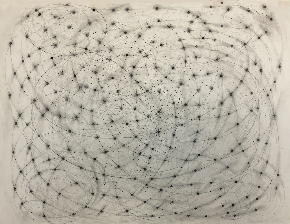 Under her designation of “Systems and Structures,” Andrea Ferrigno plots the stratosphere in graphite. In dizzying constellations, like the drawing “Static Search,” delicate contours arc from one dark polestar to another. Passages compress and then re-open as they flow across and then dive into the surface. By rendering some details slightly less focused or smaller than others, the space becomes a pulsating body of unpolished gems. Some trajectories are smudged adding more to a buoyed sensation of spatial pyrotechnics. Despite an ultimately flat, monochromatic field, she achieves full-blown pigmentation and voluminous space by improvising on the astronomical.