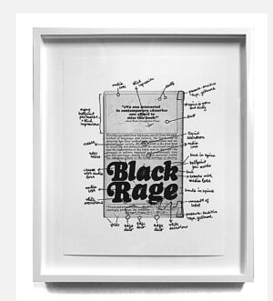 Recently, Jeff and I purchased a print “Black Rage (back cover),” which has similar notations on a book cover of the same name. This text recognizes the inherent efforts to survive and to address the struggle through research by Dr. William H. Grier and Dr. Price M. Cobb, released in 1969 following the assassination of Martin Luther King Jr. and the subsequent riots in Washington, DC. Ligon reckoned these markings to a sales receipt’s list purchasing a slave.