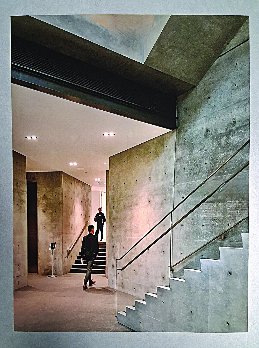 Architect Bennett Johnson relies on his foundation in design and knowledge of the materiality of buildings to create photographic environments that engage the viewer. His brutalist-focused photograph, “Chance Encounter,” is characterized by raw, exposed concrete and bold geometric forms. Johnson utilizes the post-war term to describe his approach to modernism. Brutalism rejects nostalgia and often earlier architectural styles; instead, it presents architectural elements and a tendency to embellish structure. In “Chance Encounter,” he embellishes the structure’s raw, solid elements and directs the viewer’s attention to two figures passing effortlessly through space.