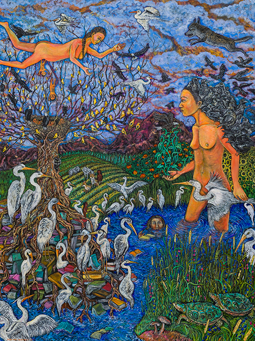 Enwrapped and intertwined, they reside within a female-focused creation story. She offers a feminist view weighted toward assisting and encouraging even in relation to the prickliness of personality or against needing to let go.