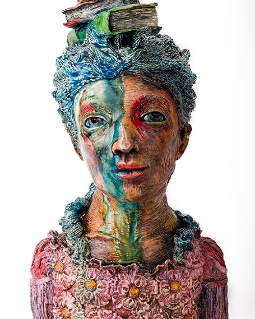 Wunderlich also creates layered work. Beginning with an idea for a story to explore, she constructs a clay figure by hand with its additional appendages. Detailing the surface with scratching, gouging, and incising, a visceral texture holds yet allows the flow of color and form to occur spontaneously from shiny colored glazes.