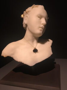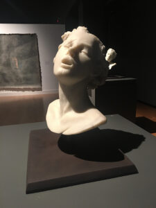 Bill Conger, Chief Curator at the Peoria Riverfront Museum, explains, “Currently in the gallery are two recent museum purchases of glass busts that truly command the gallery space. With her tilted head and heavy-lidded eyes, Africano’s “Teresa,” which loosely echoes Bernini’s “Ecstacy of St. Teresa” (1652), features two scars which arrived to the piece from a flaw in the cast glass. Through this imperfection, he inevitably saw the opportunity to symbolically render wounds of the flesh. Her counterpart “Bell,” is adorned with a bell tied around her neck as Africano’s young father did when he first arrived on the foreign-speaking shores of America in assurance that he would not wander.”