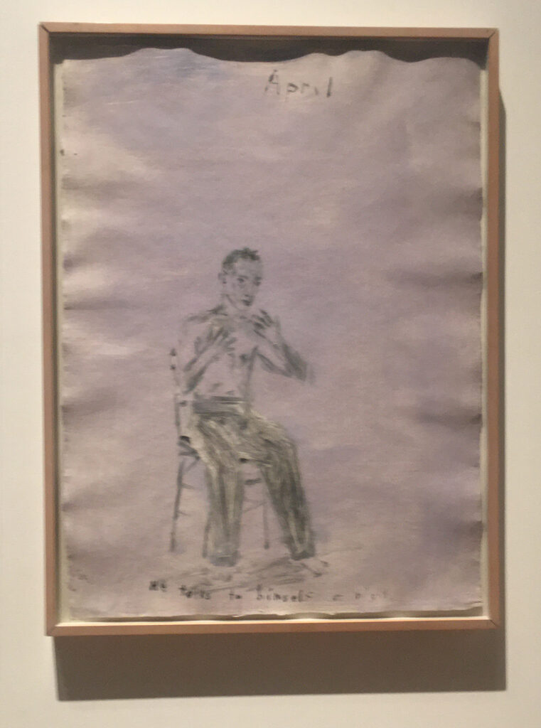 So often, interwoven into a work are words or music, any of these seemingly random scrawls insist that the viewer speak of them out loud. The melody of a floating snippet of notes or the juxtaposition of sometimes awkward gestures and/or words provide us with an introduction to his psyche.
