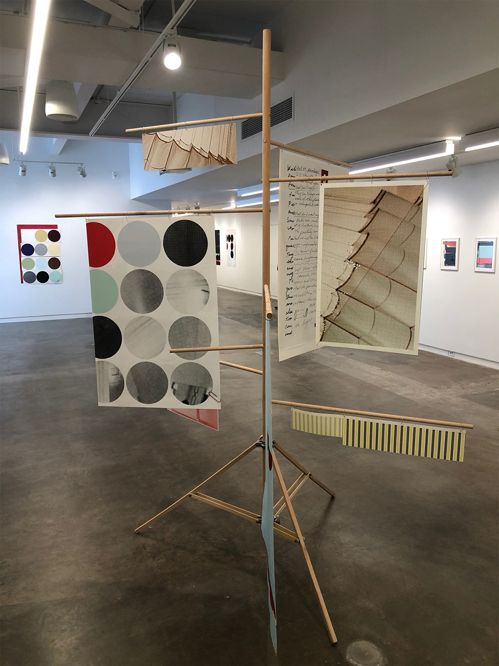 Devening’s recent show, “The Volte-Face” at Knox College was in its newly renovated Borzello Gallery. Its sleekly designed horizontal layout with polished concrete floor was exceptionally accommodating for the artist’s spare, but colorful collages and prints. The focal point was a slender wooden tripod form, roughly 100 by 90 inches, with seven paper appendages hung on horizontal wooden rods. Various sized paper works encircled a central dowel and fanned out like flags, requiring one to move around the piece and discover constantly shifting sight lines. The entire mechanism served to modulate an ensemble of formal planes, photographic fragments, and diagrams that used pattern and space to encourage a kind of visual calisthenics.