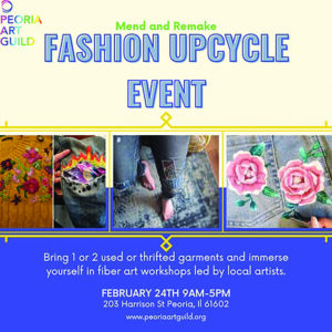 In conjunction with Boyd’s exhibition, the Peoria Art Guild is hosting a fiber event at the end of February. Join the Fiber Arts Community at “Mend and Remake: A Fashion Upcycle Event” where participants will unleash their creative impulses at this one-day thrifting extravaganza.