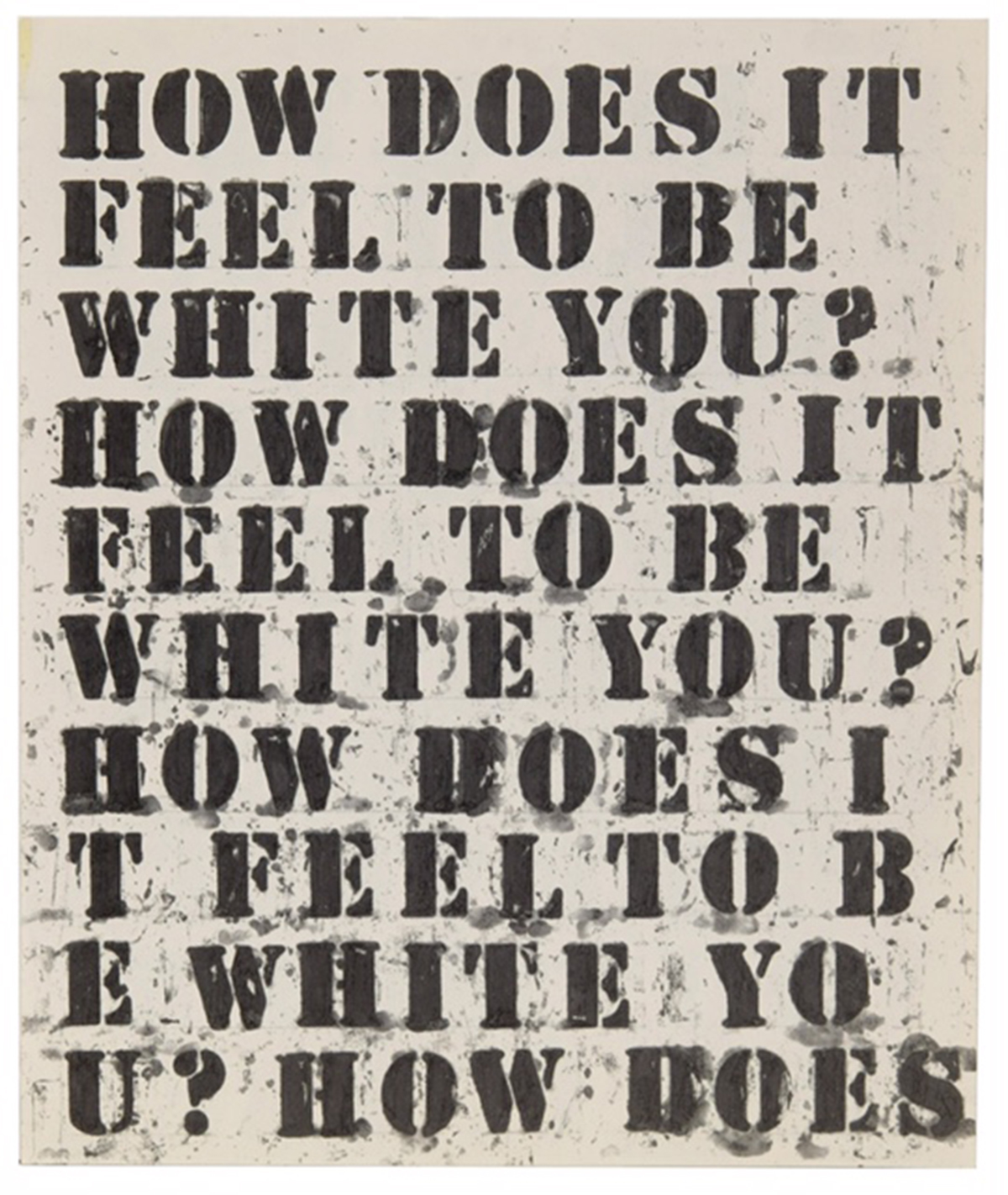 Marc Supreme took these elements and the nature of the genres to heart when he paired Glenn Ligon’s lithograph “How Does It Feel to be White You” with Tupac’s song “Changes” from 1998.