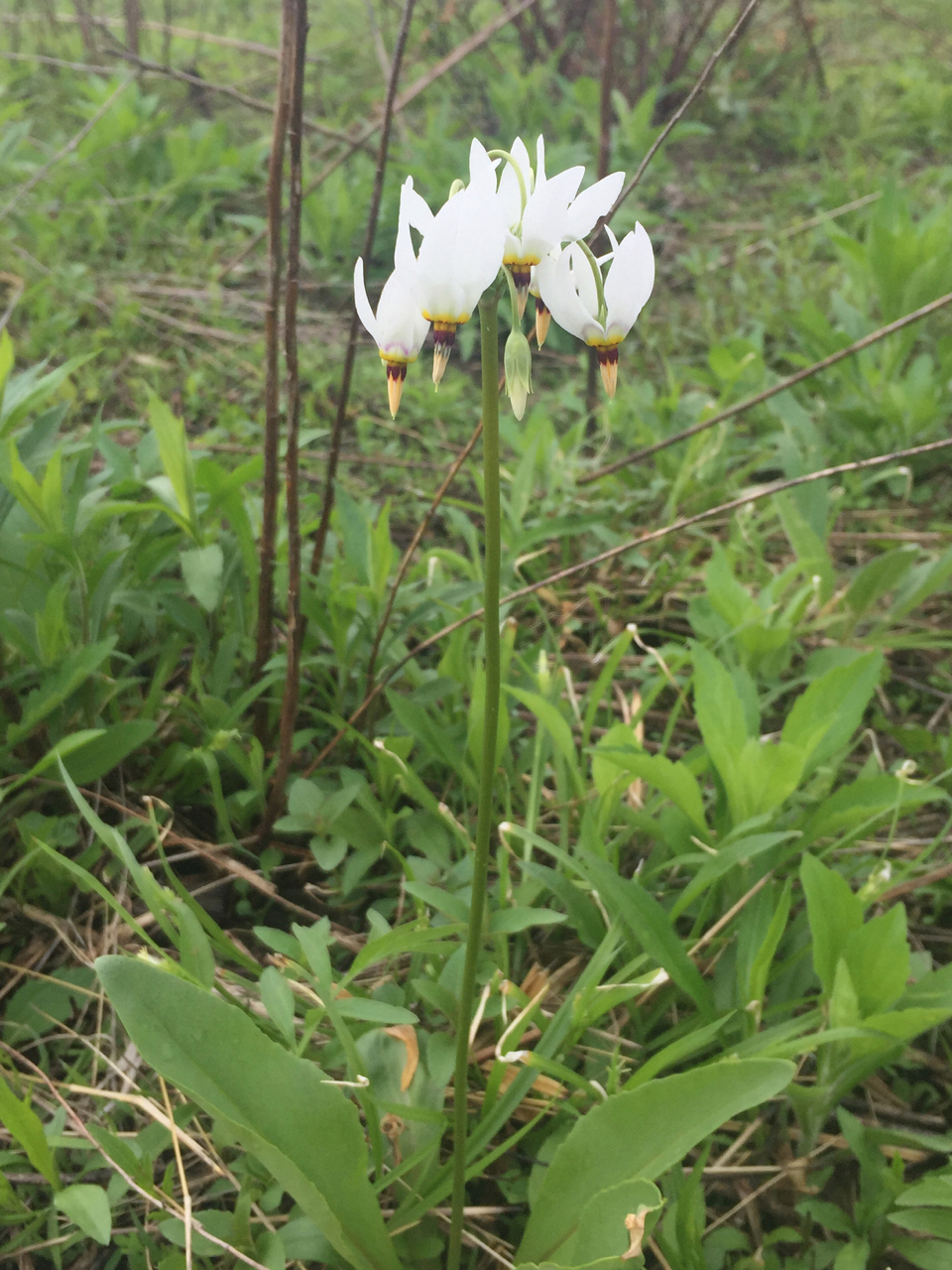 One of my favorite spring prairie wildflowers is the Shooting Star (Dodecatheon meadia). It has a basal rosette of bright green leaves that can reach up to 6 inches in length and 2 ½ inches wide. Out of this rosette can spring up one or more green or reddish colored flowering stalks. Atop the foot-long stalk, an umbel of several flowers dangle downward. Each individual flower has five white to pinkish petals that reflex upward. A bright yellow grouping of pollen bearing parts protrudes from the petals. The flower-heads look like a collection of shooting stars, hence the common name.
