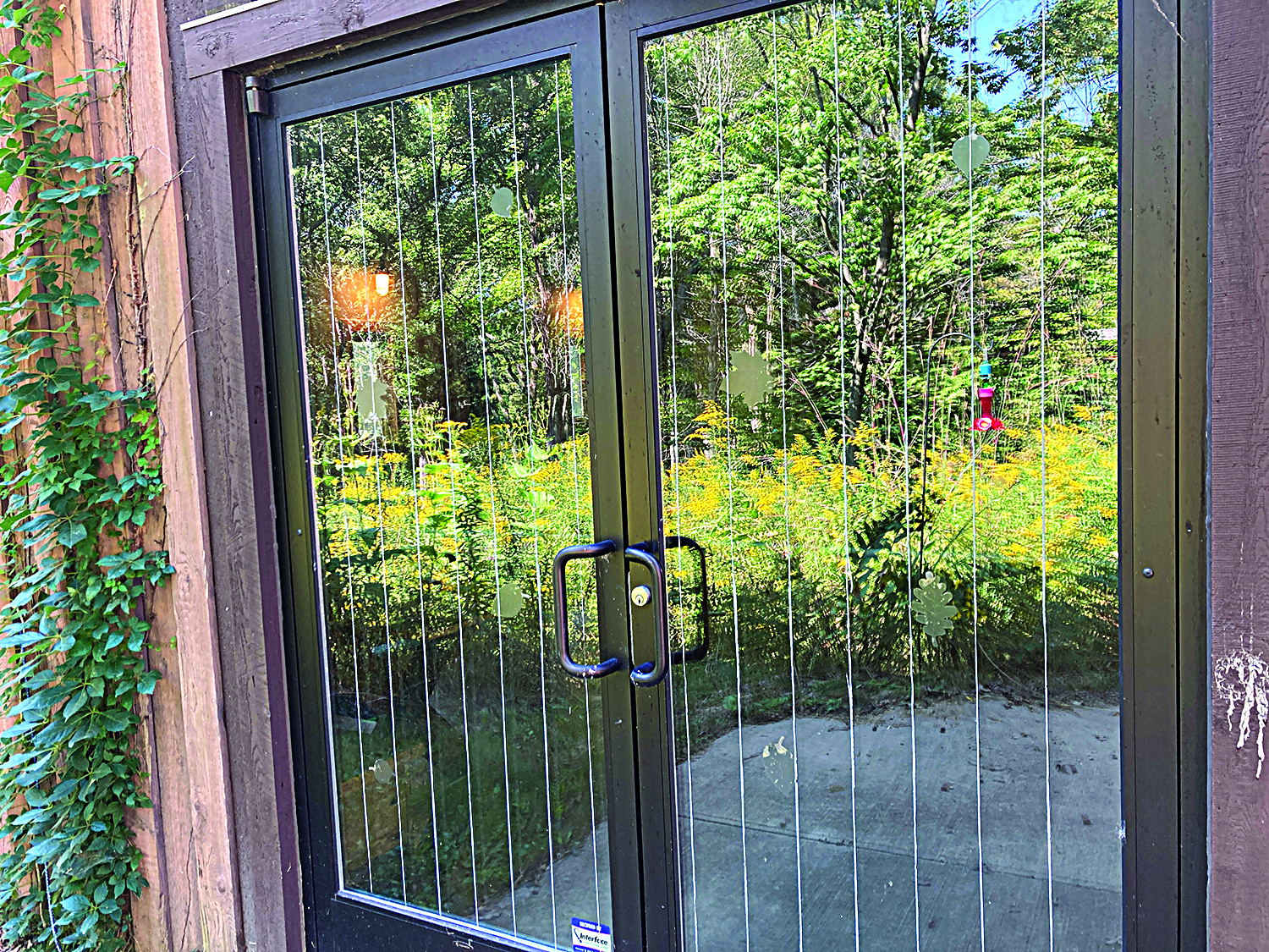 Bird-proofing a reflective surface with vertical lines at Tawny Oaks Visitor Center. This can help prevent birds from crashing