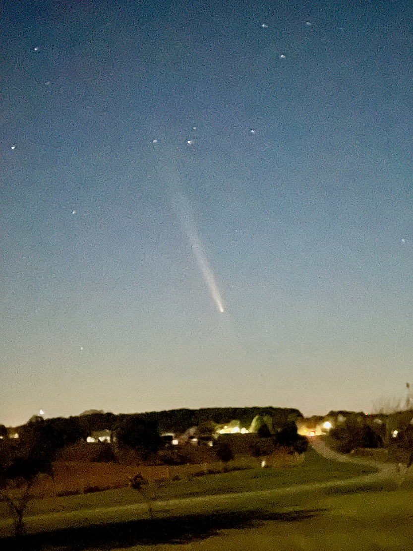 I was in the Shawnee National Forest on Oct. 14 where the skies were dark enough to see the comet with the naked eye just after sunset and before the full moon rise brightened the night skies. The comet and its long “tail” were striking on the horizon. You might think the “tail” trails behind the comet like the contrail of a jet airplane, but it is actually debris that is being “blown away” from the comet by solar winds in the vacuum of space as it nears and swings around the sun. So, the tail’s position is not related to the comet’s path of trajectory. The same solar winds that carry sun particles towards earth to create mesmerizing aurora displays also direct the direction of the comet’s tail.