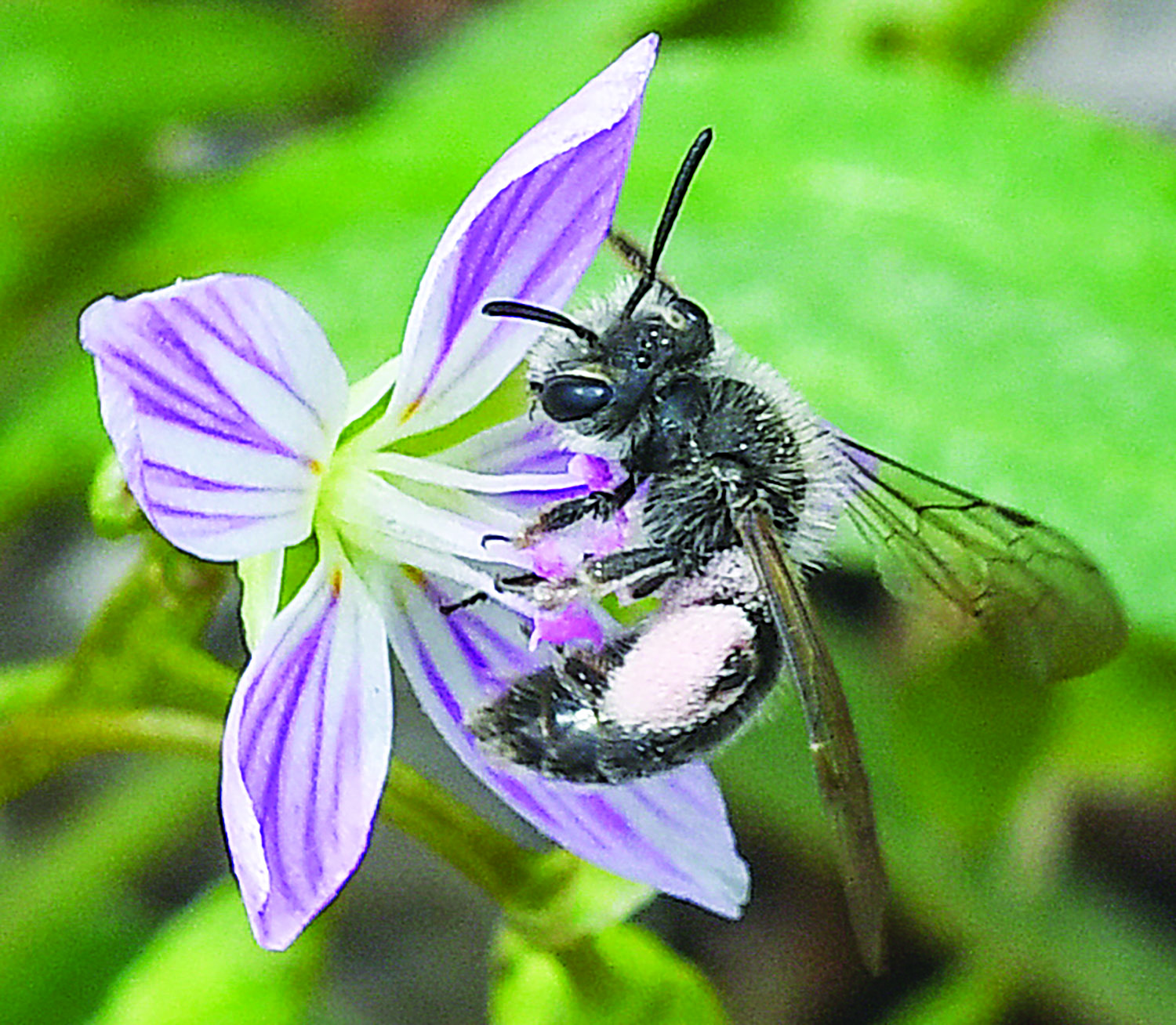 A female Spring Beauty Miner Bee gathers pollen from Spring Beauty flowers to take underground.