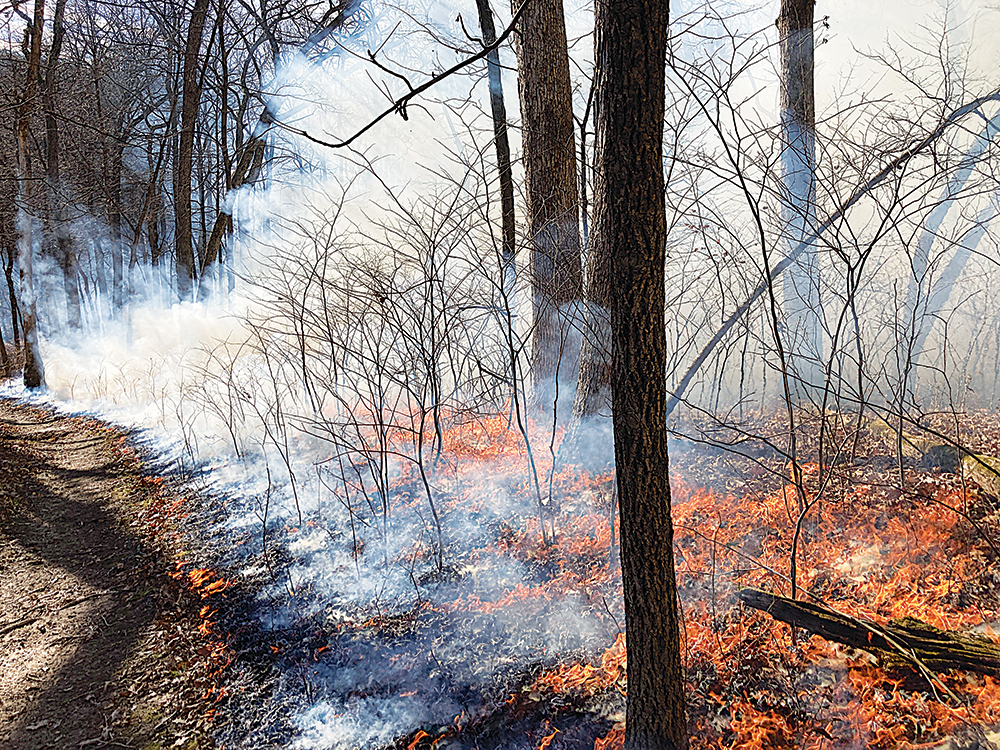 A prescribed burn moves through Camp Wokanda last month. The Peoria Park District burned land in 40 acres of the park to remove invasive plant species and preserve oak trees. (PHOTO BY MIKE MILLER )