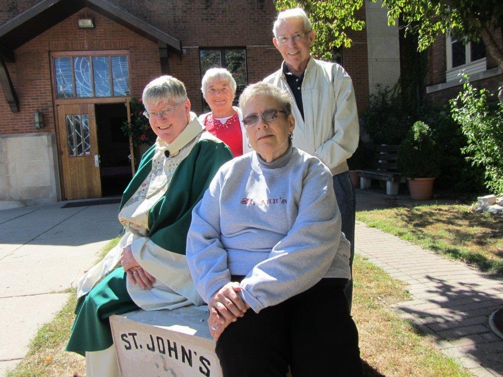 CUTLINE: Seated are Rev. Terry Cassidy, pastor at St. Ann Catholic Church in Peoria and Elizabeth Carrigan Bigger, coordinator of the St. Ann Memory Garden. Standing are members of St. Ann, Marianne and Tom Pfeifer. Marianne has belonged to the church for over 70 years, joining with her family as a child when the church was St. Boniface. Tom and his parents and siblings belonged to St. John Church originally. Marianne and Tom were married at St. Boniface.