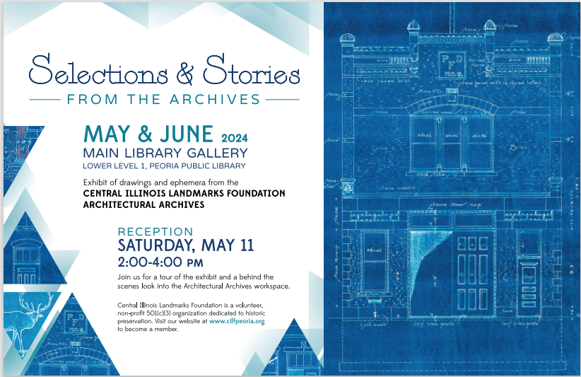This year marks the 40th anniversary of Central Illinois Landmarks Foundation’s creation of an Architectural Archive. To celebrate this milestone, the Archives Committee will be hosting an exhibit of architectural drawings and ephemera from its collection May 4 through June 28 at the Peoria Public Library Main Library Gallery. The committee invites everyone to an opening reception from 2-4 p.m. Saturday, May 11th.