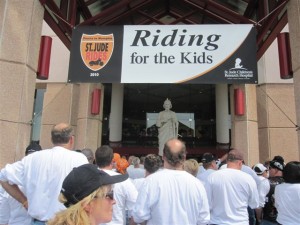 We spent Thursday night in Dyersburg, Tennessee, and Friday morning, amid a sea of white shirts and cycles, departed at 8:00 a.m. We arrived at the hospital before noon. (On a personal note, I had the opportunity to ride the last 40 miles on the back of a Harley Davison trike. Thanks to Gretchen for providing the ride, and Liz for providing the encouragement. It was an awesome ride, once I got past my apprehension.) Seeing the hospital as we rode into the city was very touching. It’s truly a building where miracles are many, and heartaches still happen.