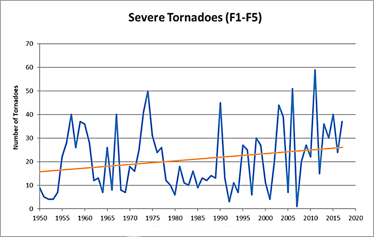 - The total number of tornadoes in Illinois are up since 1950, and the most severe tornadoes vary from year to year, but has a rising trend line (See chart).