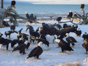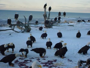 The diet of a bald eagle is truly remarkable and their determination as far as finding food if fish are not available is astounding. According to the Foundation website, “Sixty to ninety percent of a bald eagle’s diet consists of fish. The birds generally scavenge dead fish, although they will catch a live fish as well. They will take an occasional heron, crow, grouse, duck, gull, or small mammal, especially if a fish is not available…The bald eagle is an opportunist and will sometimes steal fish from an osprey or crow…The bald eagle uses several fishing techniques. A favorite method is to perch in a tree and watch a fish swimming in open water nearby and swoop down to catch it.”
