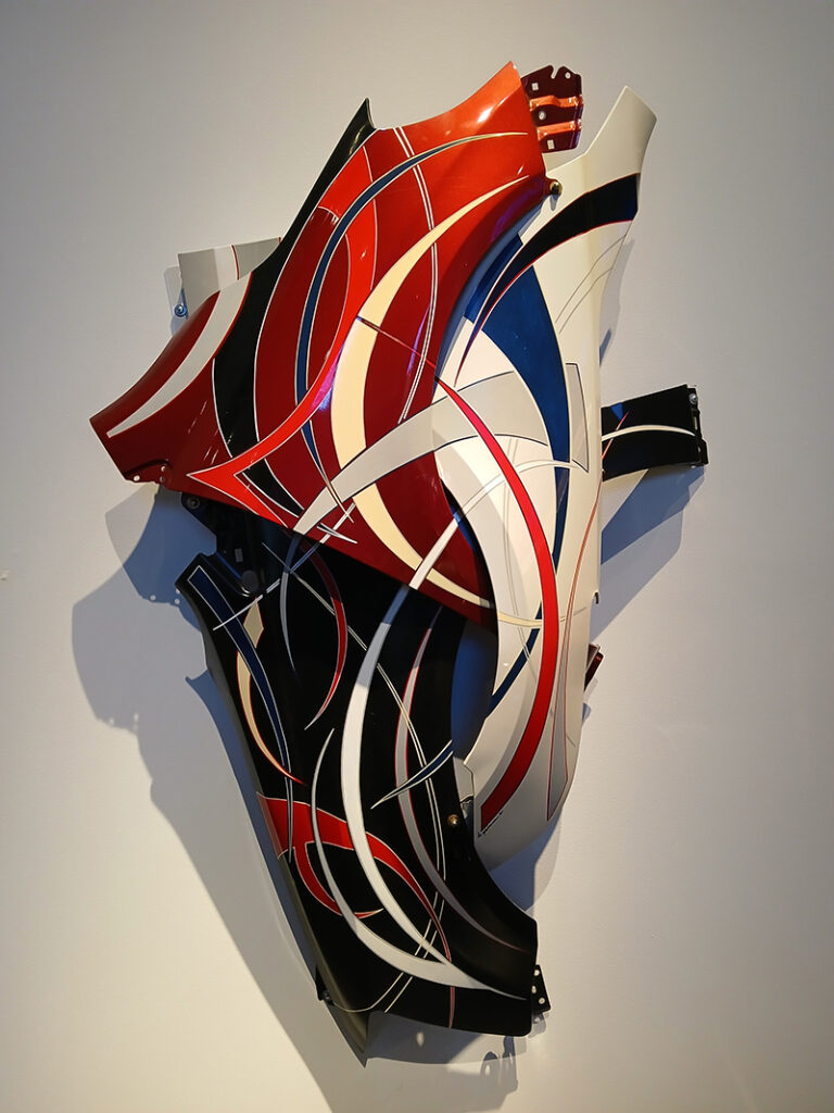 A recycled car fender sculpture, ‘a collage of pinstriping,’ by Brad Grimm of Morton is on display at Peoria Riverfront Museum as part of the ‘Built: American Custom Car Culture’.