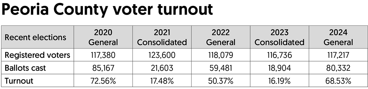 There is a slight difference between what’s a turnout — the percentage of those who registered (and therefore at some point intended to vote), and the percentage of those of the voting age of 18 (and presumably could vote). So, in Peoria County since 2020, turnouts of the percentage of registered voters who cast ballots fluctuated between 16.19% to 72.56%. (See chart.)