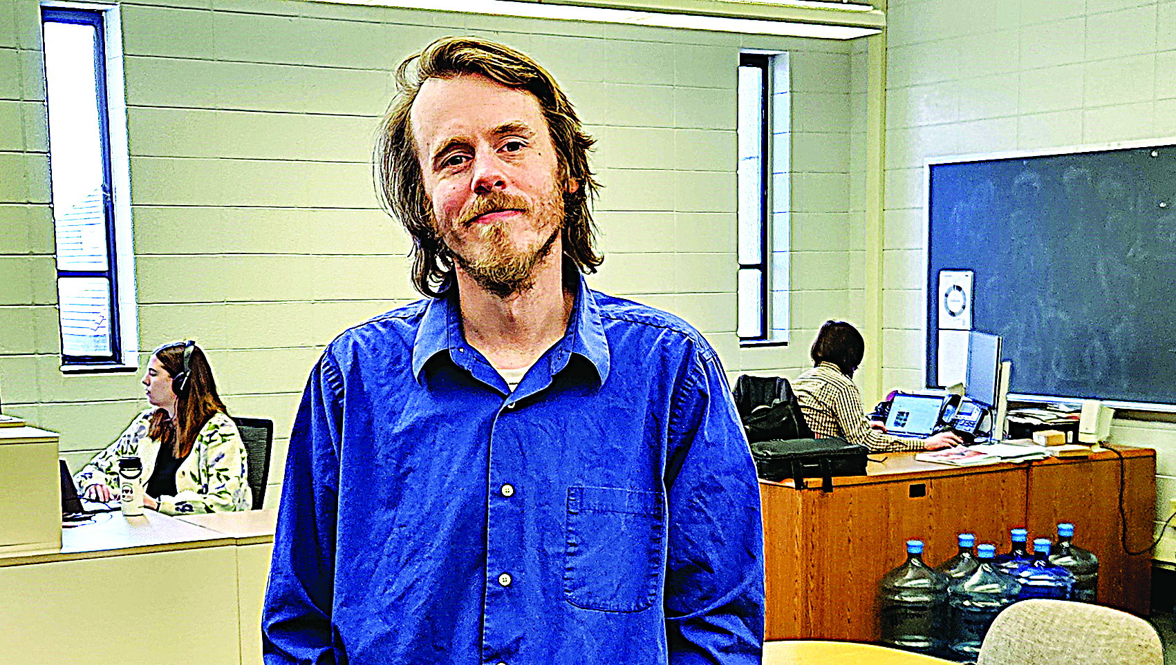 WCBU News Director Tim Shelley in the newsroom with reporters Camryn Cuttinello (left) and Collin Schopp in Morgan Hall at Bradley University.