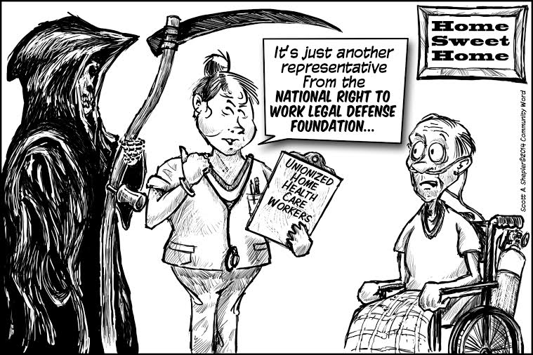 Care because this issue is at the epicenter of income inequality, fair pay, women’s rights and public subsidies for private profit. Care because unions advocate for increases in the minimum wage, and that benefits the entire economy. Care because Illinois argued in the Supreme Court in Harris vs. Quinn and lost. Assistance in that case against “fair share,” “agency fee” for unions came from the National Right to Work Legal Defense Foundation that gets support from Charles Koch and the Walton family.