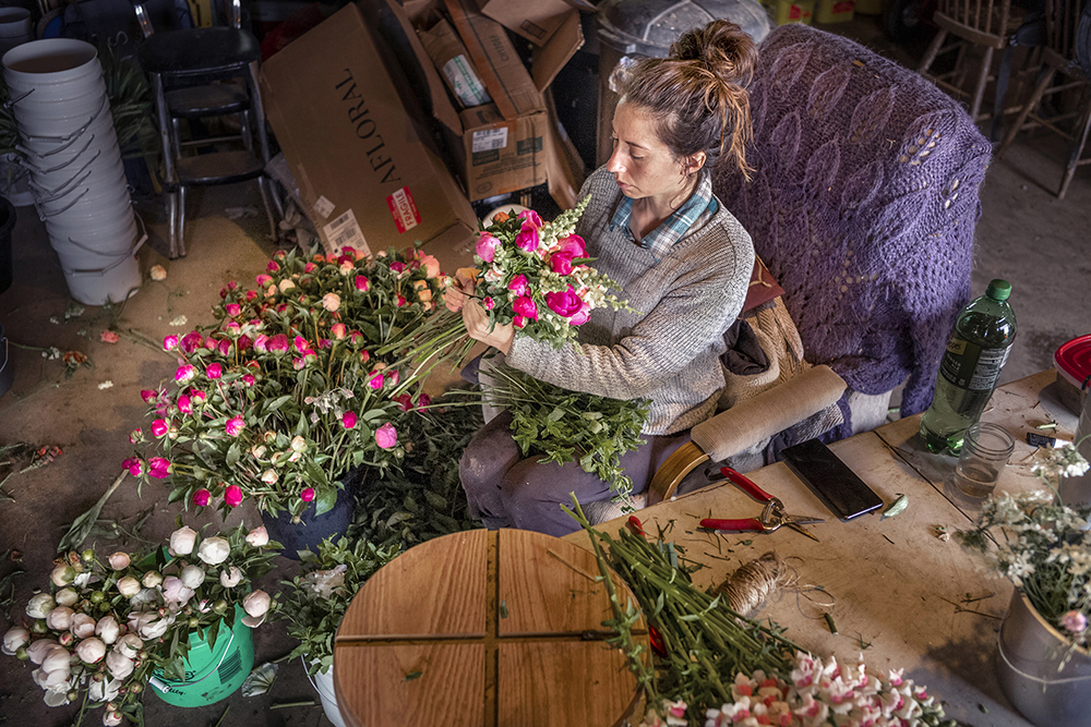 Working on arrangements for her CSA members and for sale at farmers markets, Kira Santiago is surrounded by the organic flowers she grows and sells from her East Peoria farm, Kira’s Flowers. (PHOTO BY DAVID ZALAZNIK)